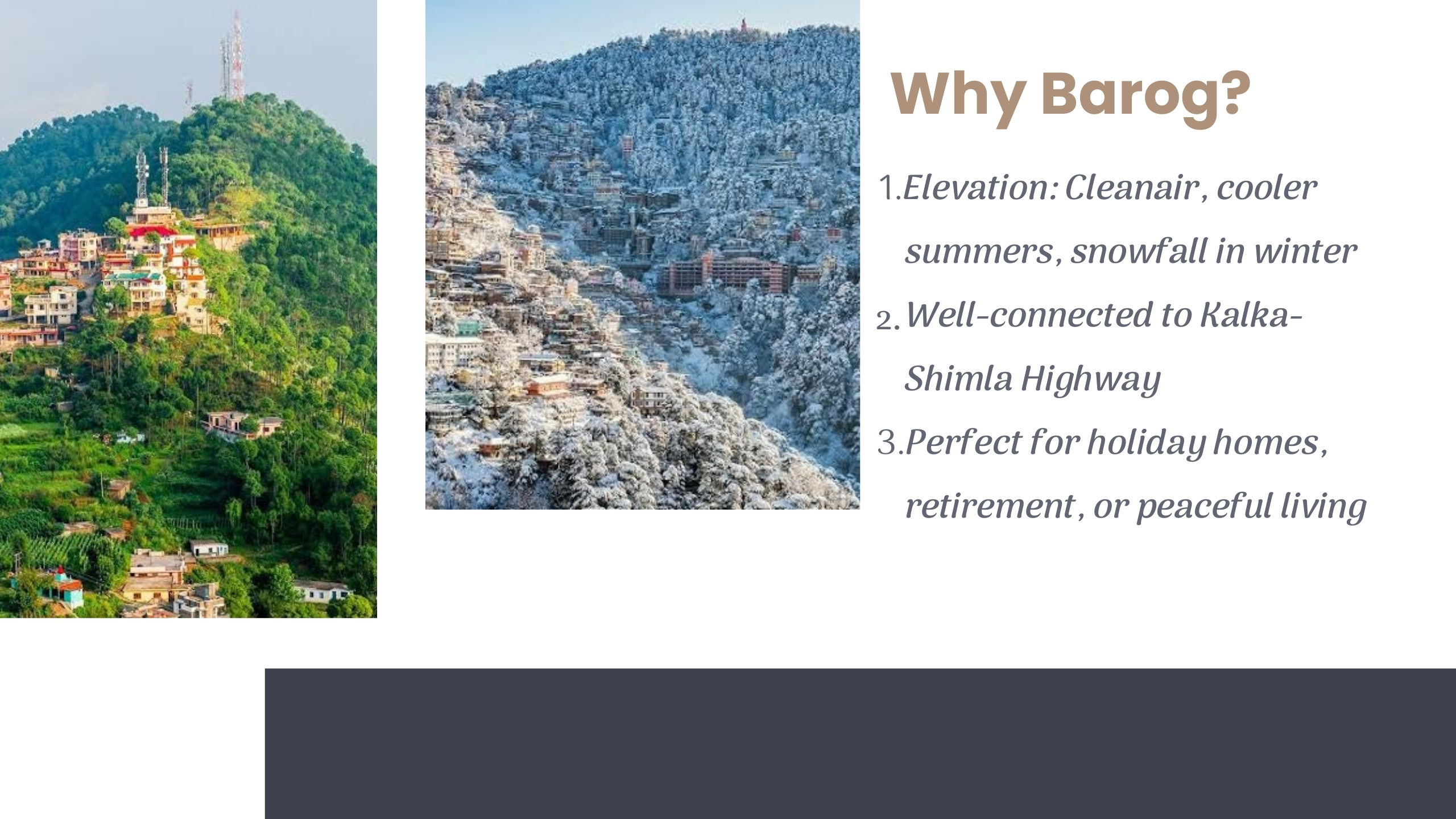 Experience elevated living at Barog Ridge Apartments, a premium S+5 residential development nestled in the scenic hills of Himachal, where nature meets modern luxury. Located near the well-connected Kalka–Shimla Highway, this project offers fresh mountain air, cooler summers, and the charm of snowfall in winter, making it ideal for holiday homes, retirement living, or peaceful everyday life.